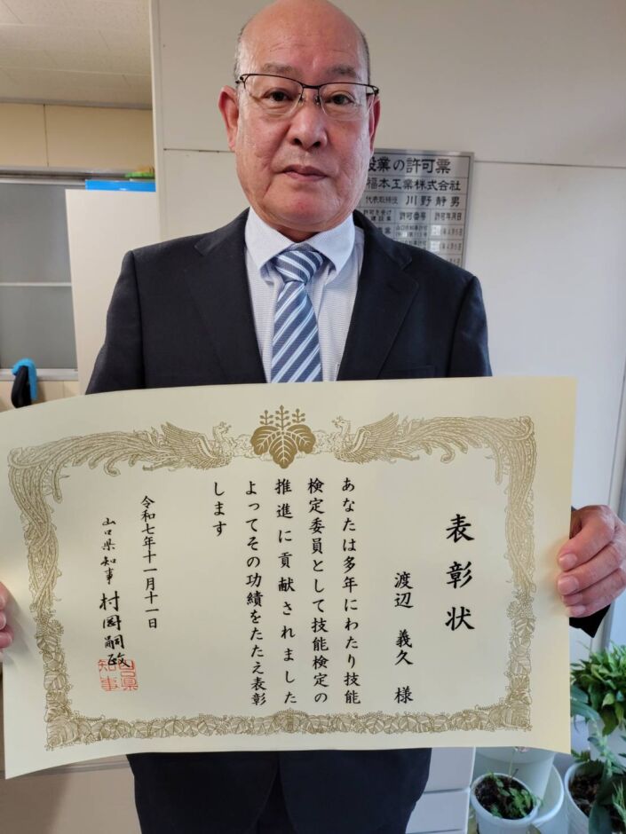 第一部の職業能力開発関係表彰式において山口県知事表彰を受賞されました。